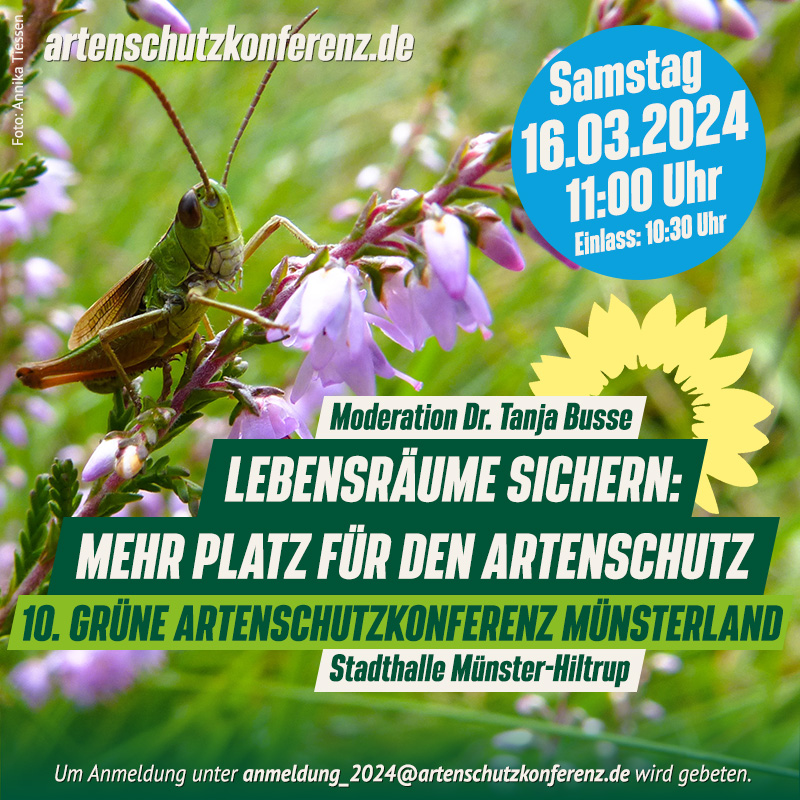 Am Samstag, den 16.03.2024 findet die 10. Grüne Artenschutzkonferenz in der Stadthalle Hiltrup ab 11:00 Uhr unter dem Themenschwerpunkt „Lebensräume sichern: Mehr Platz für den Artenschutz" statt.