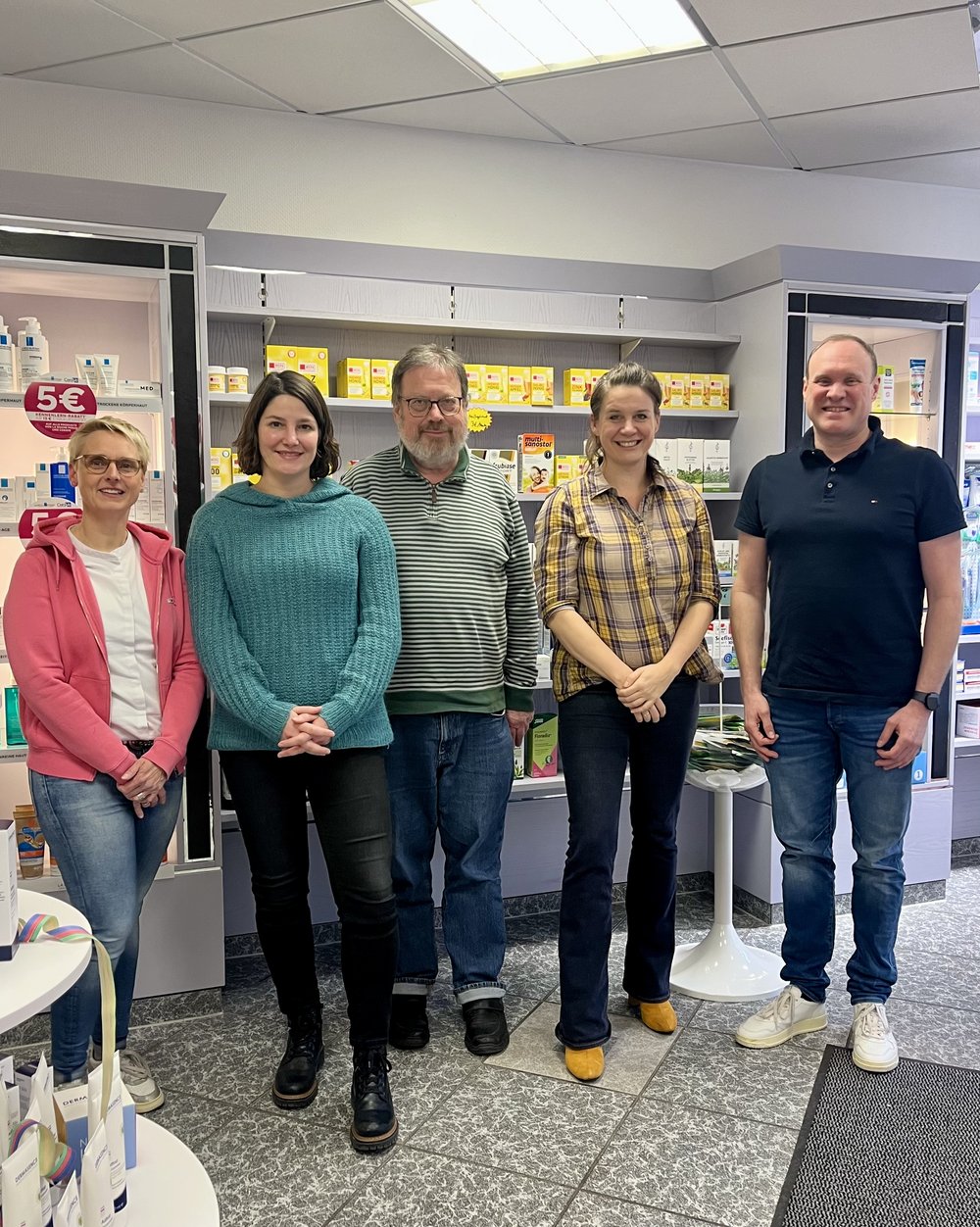 Immer mehr Apotheken in Deutschland schließen, obwohl sie gerade auf dem Land wichtige Versorgungseinrichtungen sind. In Westbevern hat die Nachfolge dem Trend entgegen funktioniert. Mit Sandra Drepper und ihrem Mann Volker hat die Bever-Apotheke neue Eigentümer gefunden, die seit etwas mehr als einem Jahr die Medikamentenversorgung im Dorf übernommen haben. „Onlinebestellungen sind längst kein Ersatz für den Service der Mitarbeitenden in Hausapotheken, die den Menschen und seine Krankheiten in Gänze kennen, mit Kundenkarten den Überblick behalten und entsprechend beraten. Die Finanzierung der Apotheken müssen wir im Hinblick auf die Sicherstellung einer guten, flächendeckenden und effizienten Versorgung reformieren“, betonte Anja Beiers, Grüne Direktkandidatin für den Kreis Warendorf und gelernte pharmazeutisch-technische Assistenten (PTA). Gemeinsam mit der Bürgermeisterkandidatin Katja Behrendt und Christoph Grünewald von den Grünen aus dem Ortsverband Telgte besuchte sie die Apotheke in Westbevern. Die neue Eigentümerin freute sich über das Interesse der Politik, sich mit der Situation von Landapotheken auseinanderzusetzen.