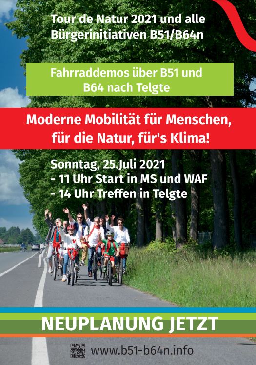 Am kommenden Sonntag, den 25. Juli 2021 findet ab 11:00 Uhr die Fahrraddemo über die B51 und B64 nach Telgte unter dem Motto "Moderne Mobilität für Menschen, für die Natur, für's Klima!" statt. In Warendorf beginnt die Tour am Bahnhof und in Münster am Schloss. Um 16:00 Uhr sollen beide Gruppen auf der Planwiese in Telgte zusammenkommen. Die Fahrraddemo wird von der Tour de Natur 2021 und den Bürgerinitiativen gegen den Neubau der B64n und den Ausbau der B51 organisiert.
