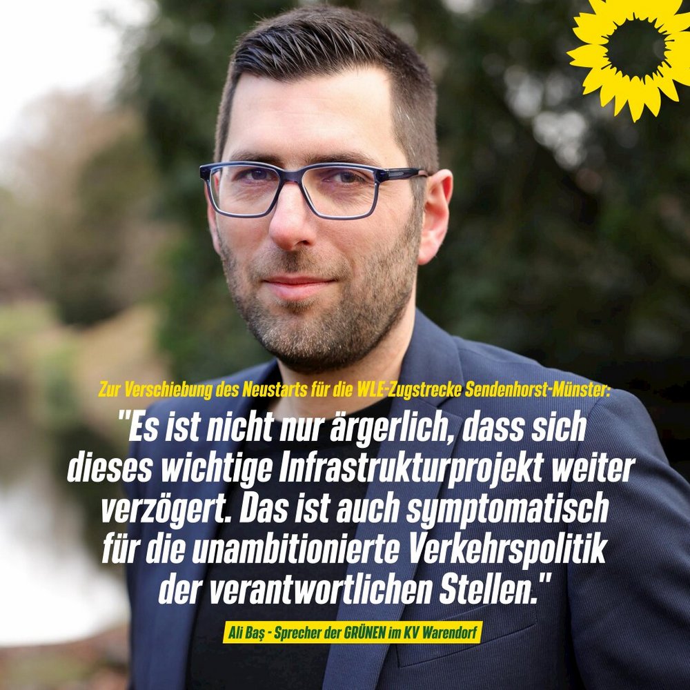 In einer Pressemitteilung macht der Co-Sprecher der Grünen im Kreis Warendorf Ali Baş seinem Ärger über die weitere Verschiebung des Neustarts für die WLE-Strecke von Sendenhorst nach Münster Luft: „Es ist nicht einfach nur ärgerlich, dass sich dieses wichtige Infrastrukturprojekt für unseren Kreis, für Münster und und vor allem für die betroffenen Menschen weiter verzögert. Das ist auch symptomatisch für die unambitionierte Verkehrspolitik der verantwortlichen Stellen, wenn solche Projekte irgendwo zwischen NWL (Zweckverband Nahverkehr Westfalen-Lippe) und DB hängen bleiben.“