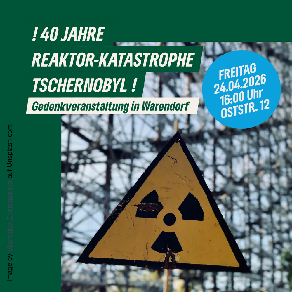 Der Kreisverband und der Ortsverband von Bündnis 90/Die Grünen Warendorf veranstaltet dazu am Freitag, 24.04.2026 um 16:00 Uhr in der Geschäftsstelle, Oststr. 12 in Warendorf, eine Gedenkveranstaltung mit Vladimir Slivyak, dem Menschenrechtsaktivisten und Träger des alternativen Nobelpreises. Slivyak arbeitet für urgewald e.V. und ist ein ausgewiesener Fachmann zu allen Themen der Nutzung der Atomenergie. Insbesondere die Rolle Russlands wird von ihm beleuchtet. Das Sprecherteam des Kreisverbands, Nicole Haferkemper‑Selau und Andreas Franitza, ist überzeugt: „Der 40. Jahrestag von Tschernobyl zeigt klar: Atomkraft und fossile Energien scheiden wegen ihrer Risiken und Umweltschäden aus. Eine verantwortbare Energiezukunft gibt es nur mit erneuerbaren, umweltverträglichen Lösungen.“