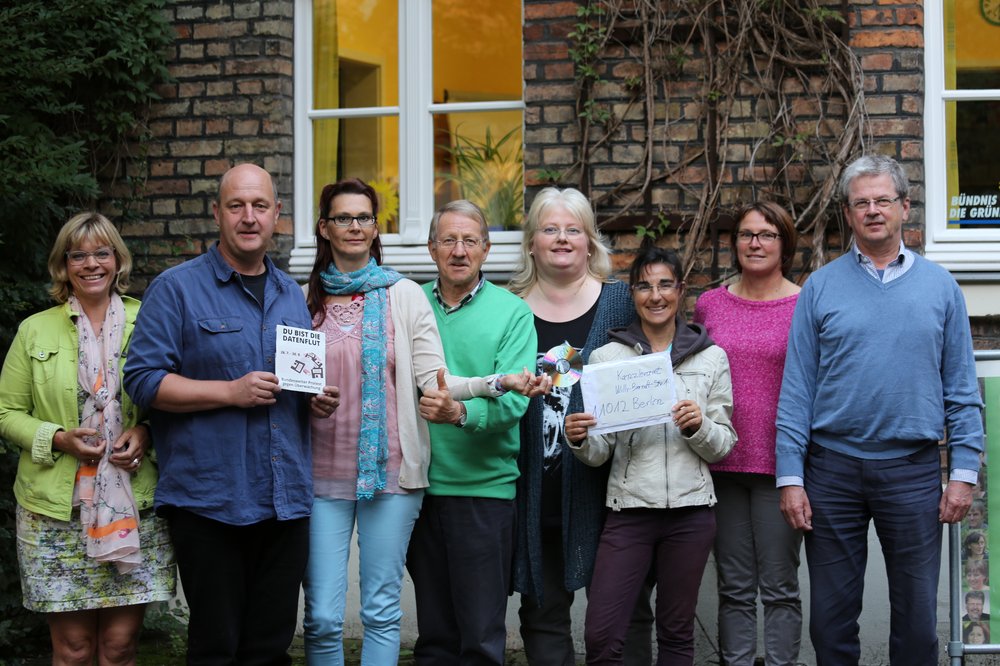 Mit einer Postsendung in das Kanzleramt nach Berlin protestierten Mitglieder der Kreistagsfraktion Warendorf von Bündnis 90/Die Grünen gegen die massenhafte Überwachung von Geheimdiensten und Internet-Konzernen."Unser Kreisverband unterstützt die Aktion 'Du bist die Datenflut', weil damit sowohl der Weg der Daten als auch die Verantwortung für die Grundrechtsverletzung sichtbar gemacht werden", erläutert Fraktionsvorsitzende Raphaela Blümer (3.v.li).
