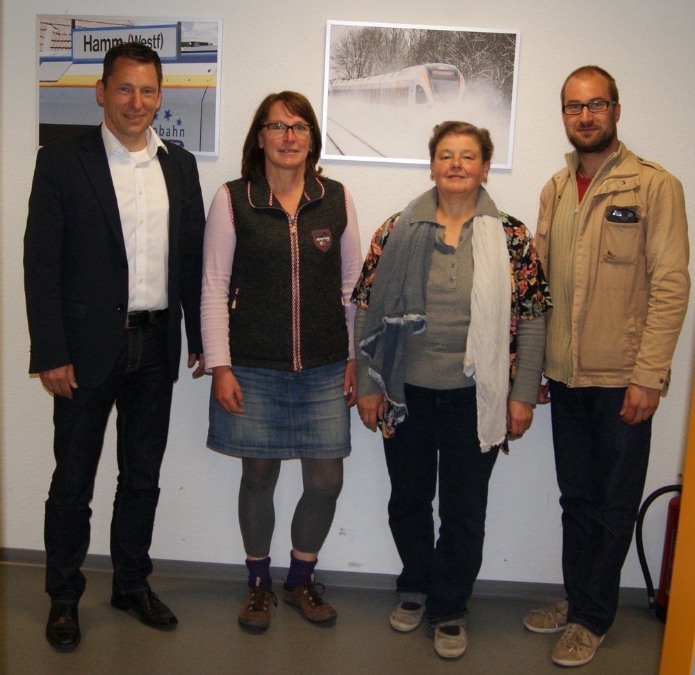 Grüne und eurobahn waren sich darin einig, dass der schnelle Ausbau der Bahnstrecke des Warendorfers mit der Sicherung der Bahnübergänge eine sehr wichtige und schnell voranzutreibende Maßnahme darstellt. Nach der nun erfolgten Beschrankung in Beelen und der für den nächsten Winter geplanten Einrichtung des Haltepunktes Einen-Müssingen sind hier Fortschritte zu verzeichnen. „Sowohl für die Sicherheit auf der Strecke als auch für die Pünktlichkeit werden diese Maßnahmen Verbesserungen nach sich ziehen“, ist sich Ingrid Hohmann de Palma, Grünes Kreistagsmitglied sicher. „Ein Großteil der Wegstrecke liegt aber noch vor uns“, weiß Hedwig Tarner, für die Grünen im Regionalrat, zu berichten. Damit spricht sie die in Planung befindlichen Bahnübergangssicherungen im Bereich Warendorf und Telgte an. „In den nächsten Jahren werden die an der Planung Beteiligten – Gemeinden, Kreis, Straßen NRW und DB-Netz – auf diesem Feld stark gefordert sein“, so Tarner. „Unsere Triebfahrzeugführer wären sehr froh über eine schnelle technische Sicherung der Übergänge!", ist sich Marcus Klugmann sicher. Derzeit sind die Mitarbeiterinnen und Mitarbeiter der eurobahn aufgrund der zahlreichen Gefahrenstellen einer hohen zusätzlichen Belastung ausgesetzt.