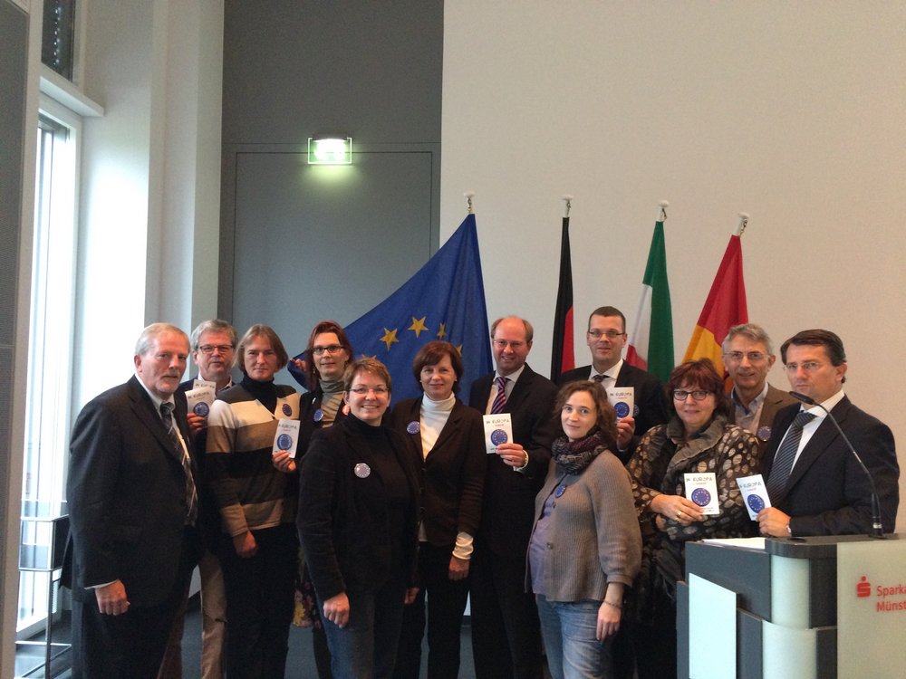 Mit einer gemeinsamen Aktion setzten die Kreistagsmitglieder ein deutliches Zeichen für Europa, indem sie sich Butttons mit dem Symbol der Europaflagge ansteckten. Auf dem Foto sind Vertreter aller Fraktionen im Kreistag mit Landrat Dr. Gericke vor den üblichen vier Flaggen im Sitzungssaal. In der folgenden Abstimmung lehnte der Kreistag, nach heftigen Grundsatz-Wortbeiträgen, den unsäglichen Antrag der AfD "mit ganz großer Mehrheit ab" (Dr Gericke).